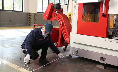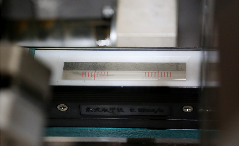 - Front-Back Leveling: Place the spirit level on the feeding axis guide rail and adjust the front-back level by turning the bolt at the center of the rear bottom of the bed. When the bubble is again centered, the front-back leveling is complete. Finally, tighten the bolt to finish the machine bed leveling process.